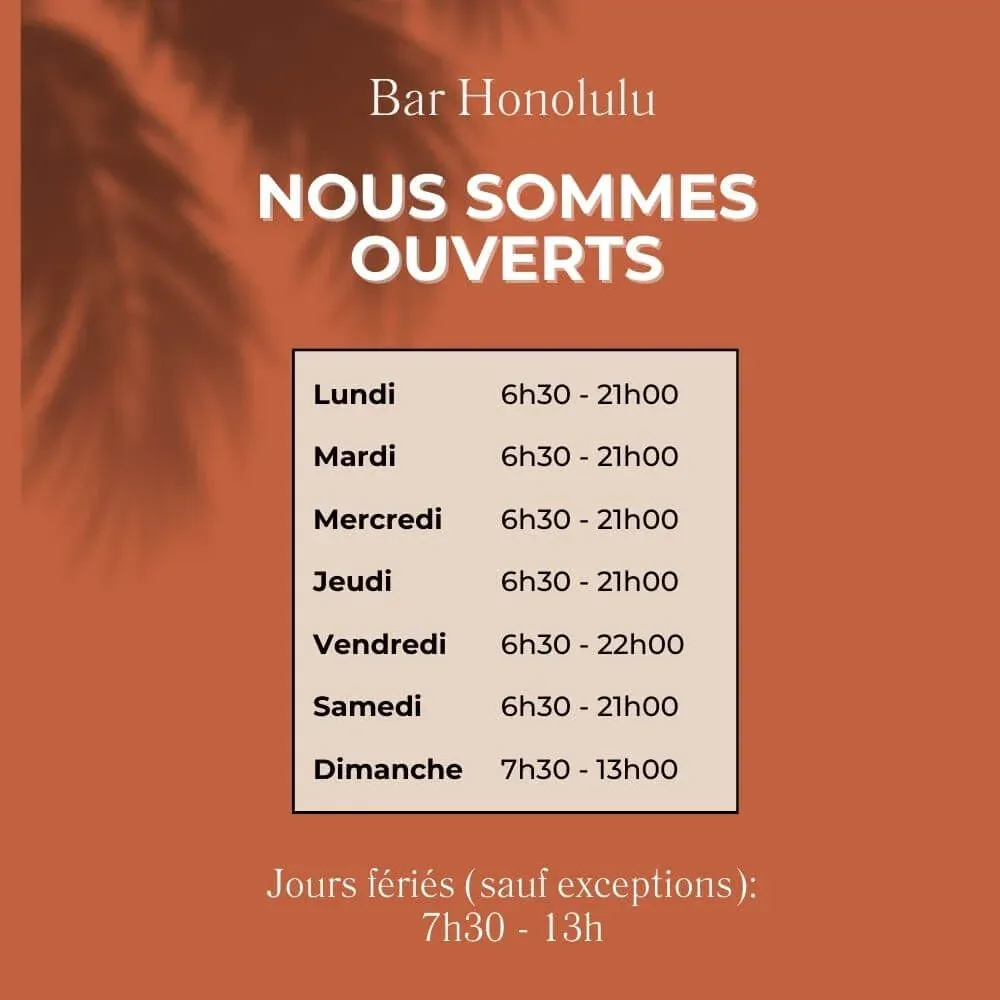 - Bar Honolulu : Lundi - Samedi 6h30 - 21h, Dimanche 7h30 - 13h