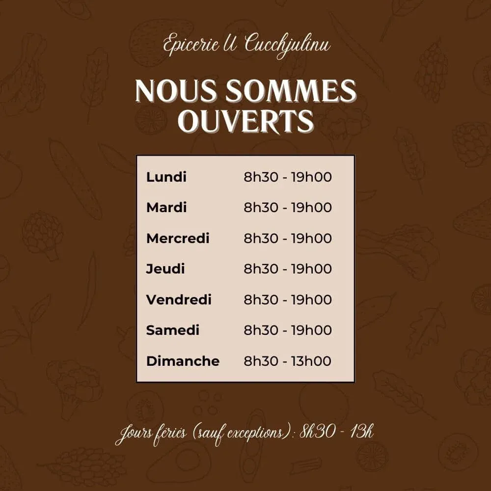 - Épicerie U Cucchjulinu : Lundi - Samedi 8h30 - 19h, Dimanche 8h30 - 13h
